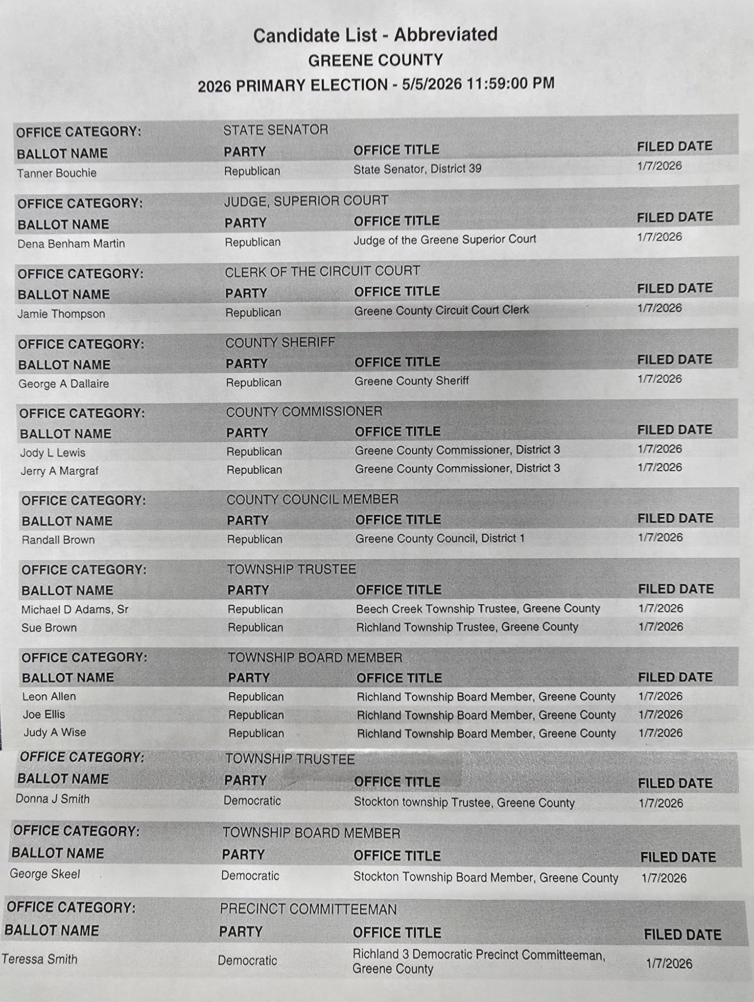 - County Leadership: Current Greene County Sheriff George A. Dallaire (Republican) and Circuit Court Clerk Jamie Thompson (Republican) have both officially filed for their respective offices.