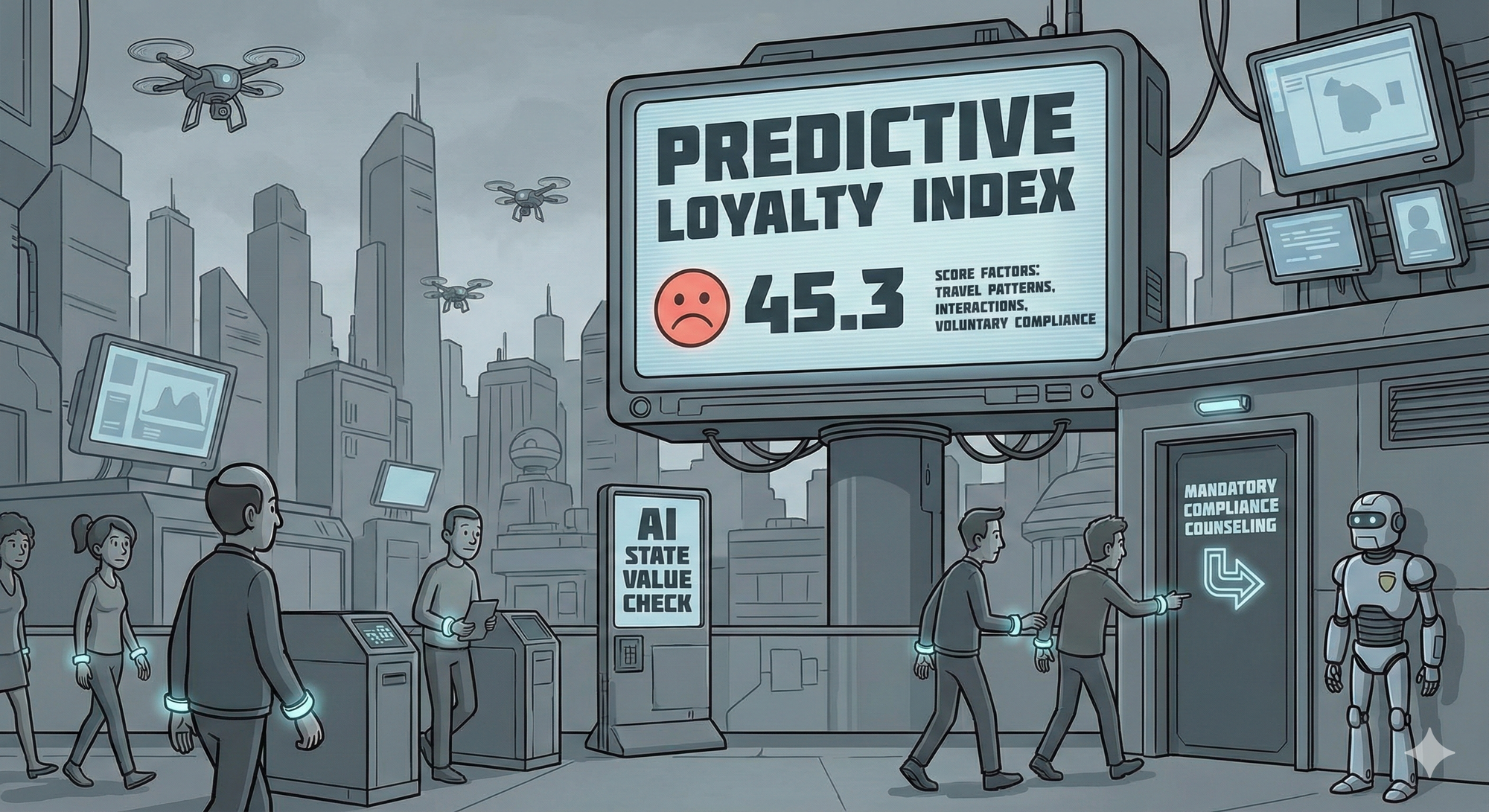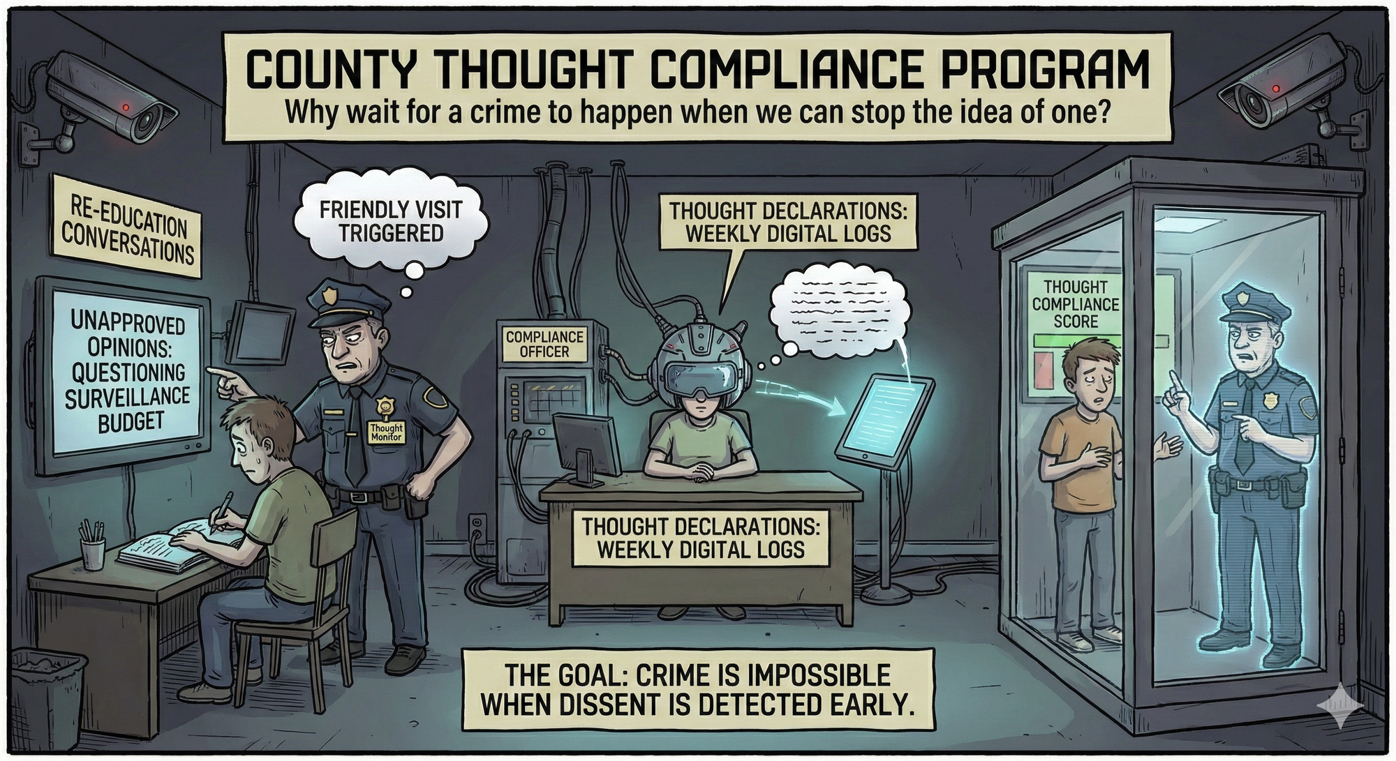 - Re-education Conversations: Any "unapproved opinions" (e.g., questioning the surveillance budget) trigger a friendly visit from a compliance officer.
