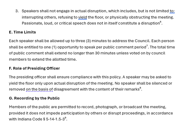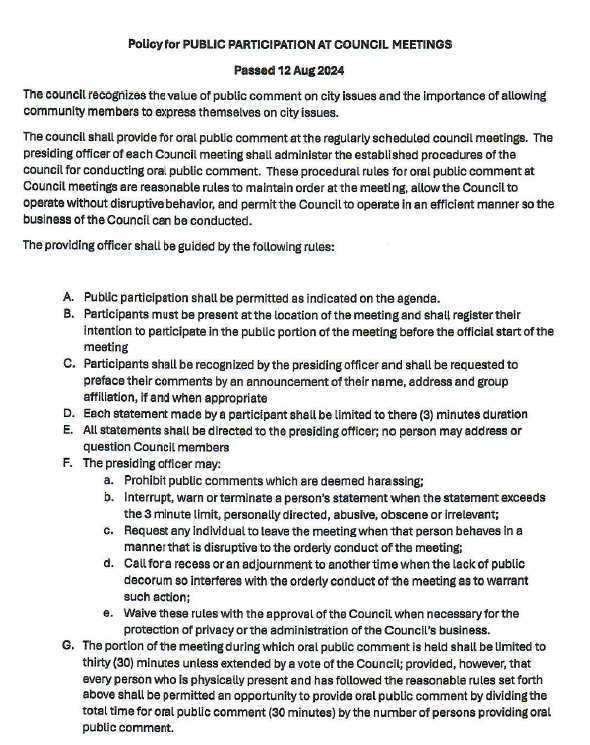 Right now, the City of Linton has a public comment policy in place that—whether intentionally or not—violates the First Amendment. It prohibits “personal attacks,” “undue repetition,” and speech labeled as “obscene.” On paper, that may sound like a way to keep things orderly. But in practice, policies like this have been used across the country to silence dissent, shut down criticism, and prevent everyday people from addressing real concerns—especially when those concerns are directed at public officials.