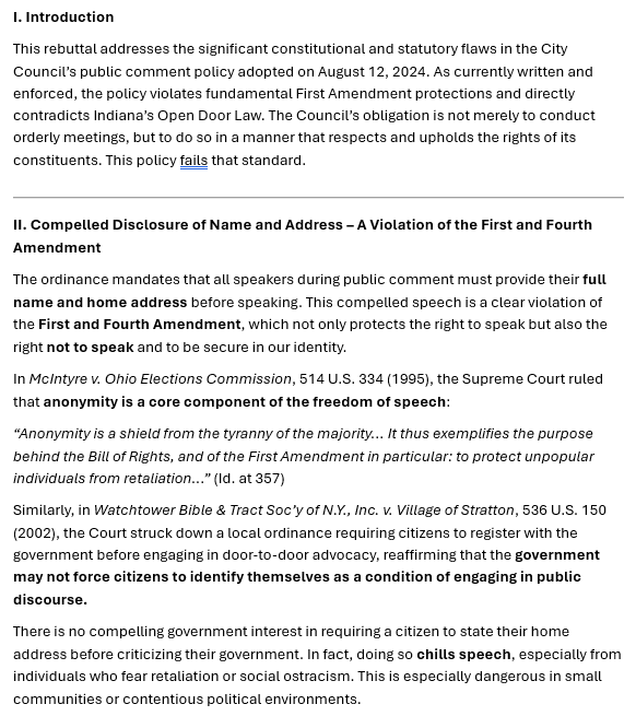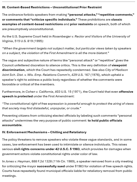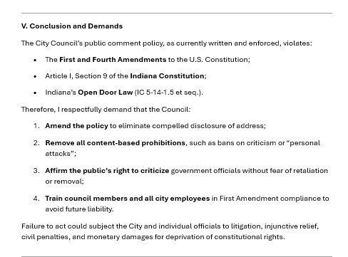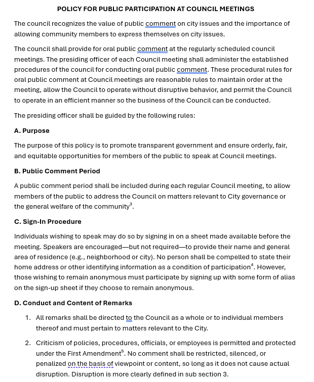That’s why I’m also asking alongside my request that the city removes this unconstitutional policy, that all city employees and council members receive First Amendment training. Not to call anyone out, not to play politics, but to ensure that going forward, no one’s rights are unintentionally trampled. Understanding the Constitution isn't just for lawyers—it's for anyone in public service.